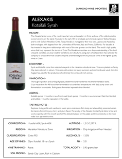 Explosive fruity profile with vanilla and sweet spice undertones. Rich body and a beautifully presented velvet-like tannins frame the juicy cherry and plum flavors. The acidity of the Alexakis Kotsifali Syrah blend is fine and works expertly with the smooth alcohol. This delicate balance on the palate and the complexity on the nose make it an age-worthy wine.