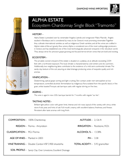 Brilliant light-yellow color with green hints. Intense and rich nose, typical of the variety, with citrus, white stone fruits, pear, and hints of oak. Full mouth, creamy, with excellent balance, freshness, and finesse. Persistent after taste aromas with long finish.