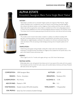 Brilliant light-yellow color with greenish hints. Intense and rich nose, typical of the variety, with citrus, passion fruit, honeydew, and hints of oak. Full mouth, creamy, with excellent balance, freshness, and finesse. Persistent after taste aromas with long finish.