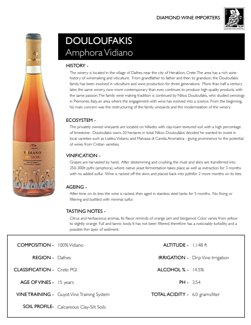 The privately owned vineyards are located on hillsides with clay-loam textured soil, with a high percentage of limestone. Douloufakis owns 20 hectares in total. Nikos Douloufakis’ decided he wanted to invest in local varieties such as Liatiko, Vidiano, and Malvasia di Candia Aromatica - giving prominence to the potential of wines from Cretan varieties.