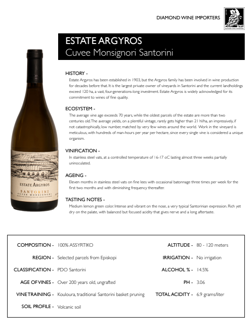 Medium lemon green color. Intense and vibrant on the nose, a very typical Santorinian expression. Rich yet dry on the palate, with balanced but focused acidity that gives nerve and a long aftertaste.