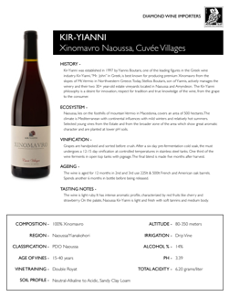 The wine is light ruby. It has intense aromatic profile, characterized by red fruits like cherry and strawberry. On the palate, Naoussa Kir-Yianni is light and fresh with soft tannins and medium body.