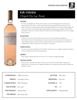 ’Esprit du Lac or ‘’the spirit of the lake’’ is the new rose wine from Kir-Yianni Estate. It captures the dynamic spirit of Xinomavro into an elegant refreshing rose wine. Light body, fresh acidity with peach and strawberry aromas.