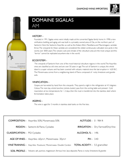 The vineyards of Santorini from one of the most historical viticulture regions in the world. The Assyrtiko vines are classified as old vines and are over 50 years in age. The soil of Santorini is unique, the whole island is a super volcano and has been covered with volcanic material since the last eruption in 1620 B.C. The Monemvasia comes from a neighboring island of Paros composed of rocky limestone and granite soils.