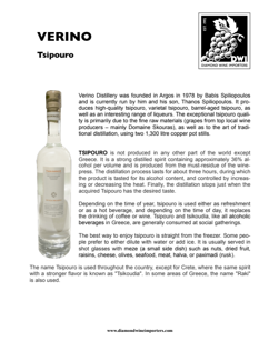 TSIPOURO is not produced in any other part of the world except Greece. It is a strong distilled spirit containing approximately 36% alcohol per volume and is produced from the must-residue of the winepress. The distillation process lasts for about three hours, during which the product is tasted for its alcohol content, and controlled by increasing or decreasing the heat. Finally, the distillation stops just when the acquired Tsipouro has the desired taste.