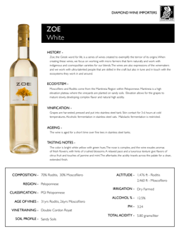 The color is bright white yellow with green hues. The nose is complex, and the wine exudes aromas of fresh flowers, with hints of crushed blossoms. A relaxed pace and a luxurious texture give flavors of citrus fruit and touches of jasmine and mint. The aftertaste, the acidity travels across the palate for a clean, extended finish.